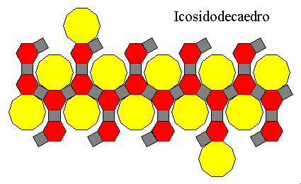 Questo poliedro è composto da 62 facce: 12 decagoni ( poligoni con 10 lati ), 20 esagoni e 30 quadrati, tutti con lo stesso lato. Il rapporto spigolo/interraggio, in questo caso, vale 0.265. Nel disegno a sinistra ne vediamo lo sviluppo... |